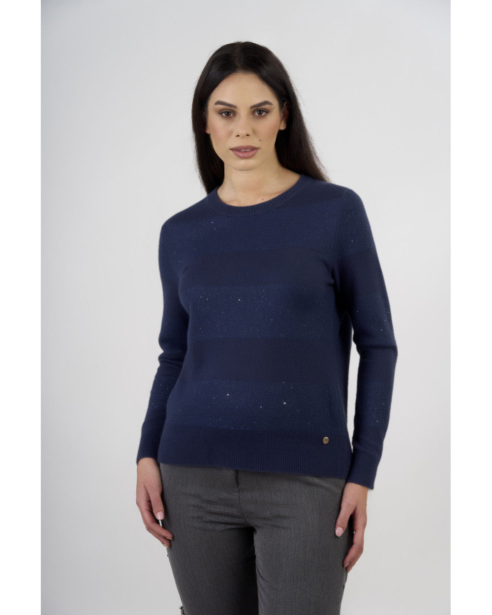 Maglia a righe dallo stile casual-chic, realizzata in una morbida maglia elasticizzata impreziosita da una delicata lavorazione con micro paillettes che regala luminosità e movimento al tessuto.