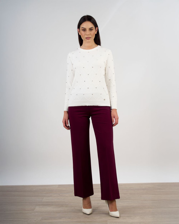 Maglia elegante con trama a rombi e luminose applicazioni gioiello, pensata per aggiungere un tocco sofisticato e femminile ai tuoi outfit.
