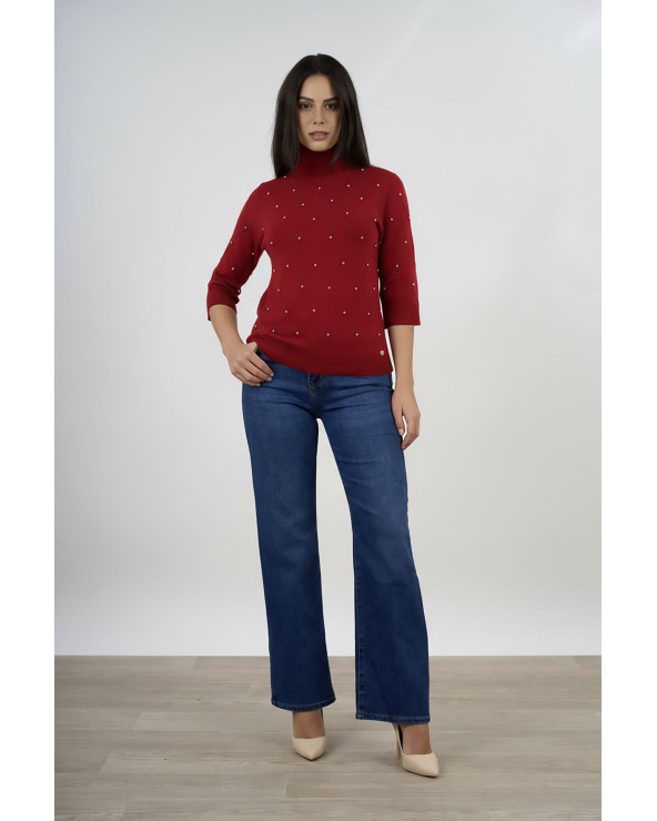 Maglia elegante con trama a rombi e luminose applicazioni gioiello, pensata per aggiungere un tocco sofisticato e femminile ai tuoi outfit.