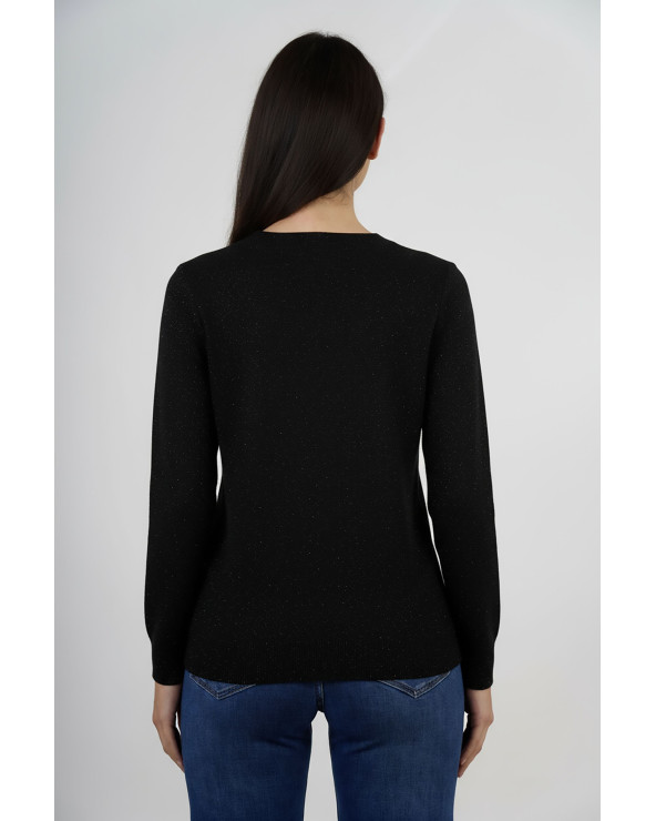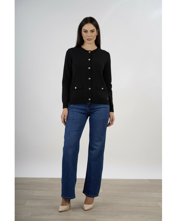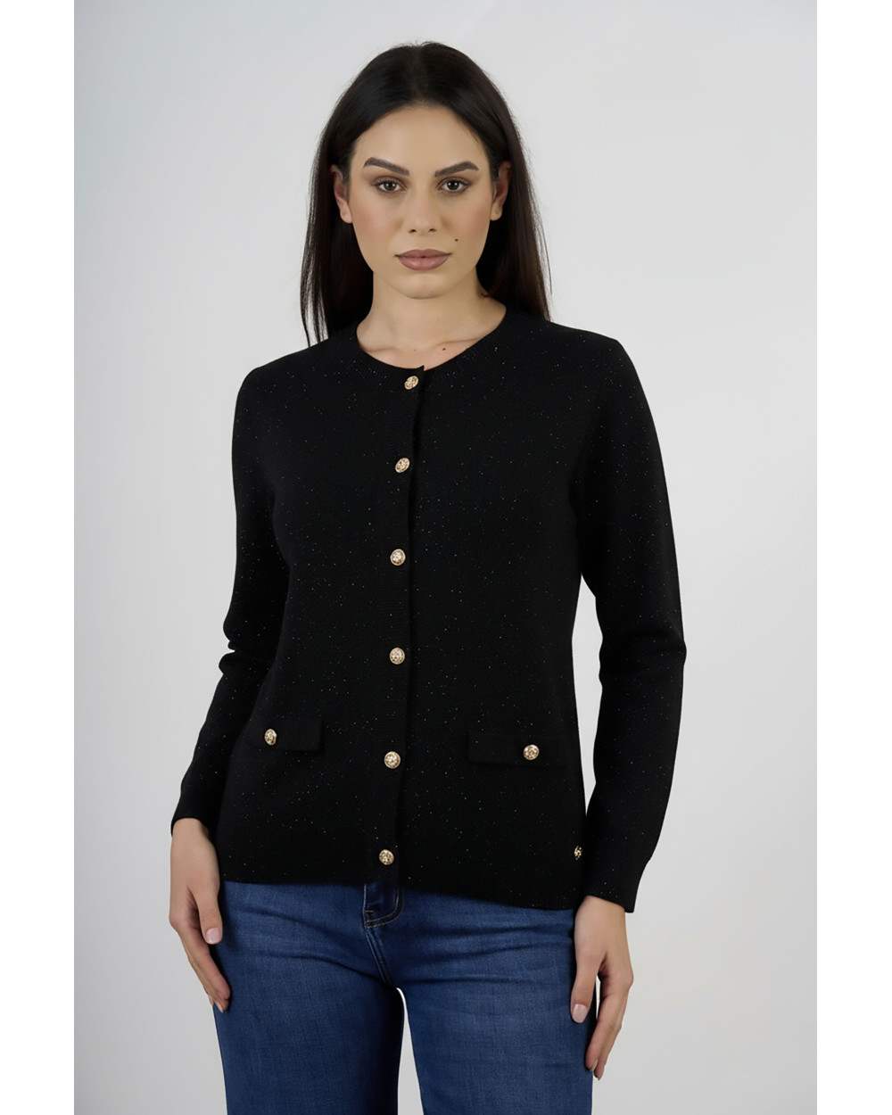 Realizzato in filato morbido e confortevole, presenta una chiusura frontale con bottoni decorativi e due tasche applicate con patta che donano un tocco classico e femminile.