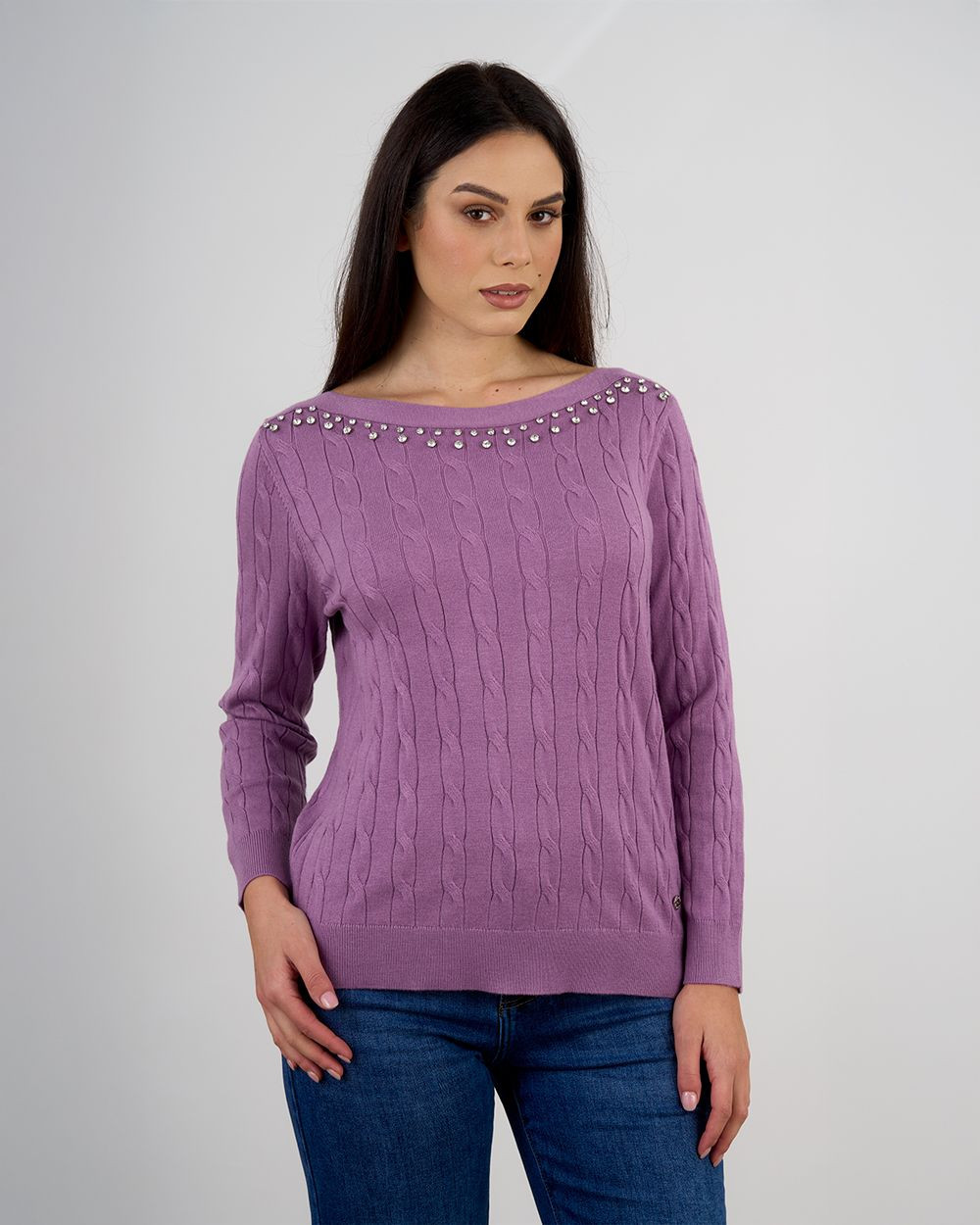 Maglia dallo stile femminile e raffinato con scollo a barca ampio impreziosito da inserti gioiello luminosi che donano un tocco di eleganza discreta.