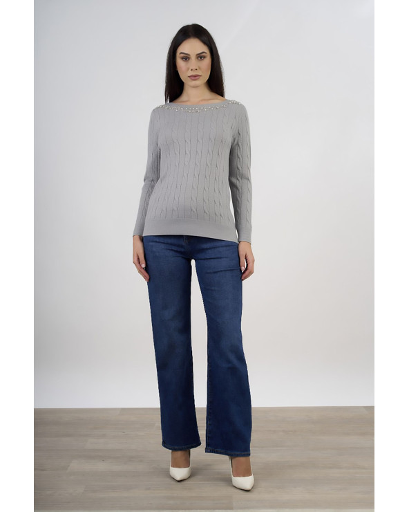 Maglia dallo stile femminile e raffinato con scollo a barca ampio impreziosito da inserti gioiello luminosi che donano un tocco di eleganza discreta.