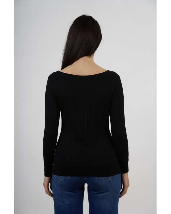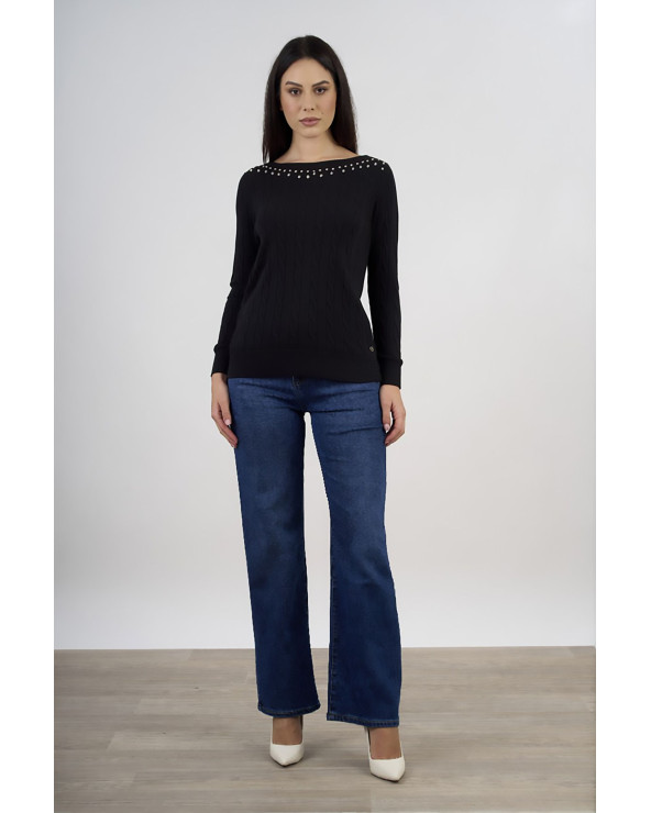 Maglia dallo stile femminile e raffinato con scollo a barca ampio impreziosito da inserti gioiello luminosi che donano un tocco di eleganza discreta.