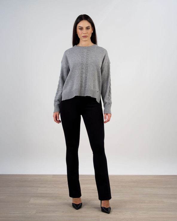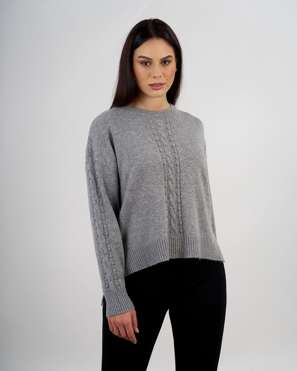 Realizzata in filato morbido con lana, presenta una lavorazione a trecce che impreziosisce il davanti e le maniche, donando un tocco raffinato al design.