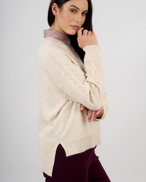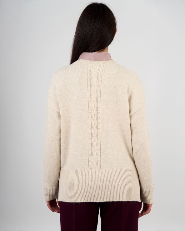 Realizzata in filato morbido con lana, presenta una lavorazione a trecce che impreziosisce il davanti e le maniche, donando un tocco raffinato al design.