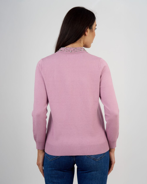 Realizzata in morbido filato elasticizzato, presenta un elegante colletto decorato con applicazioni gioiello e una mezza abbottonatura frontale con bottoni tono su tono.