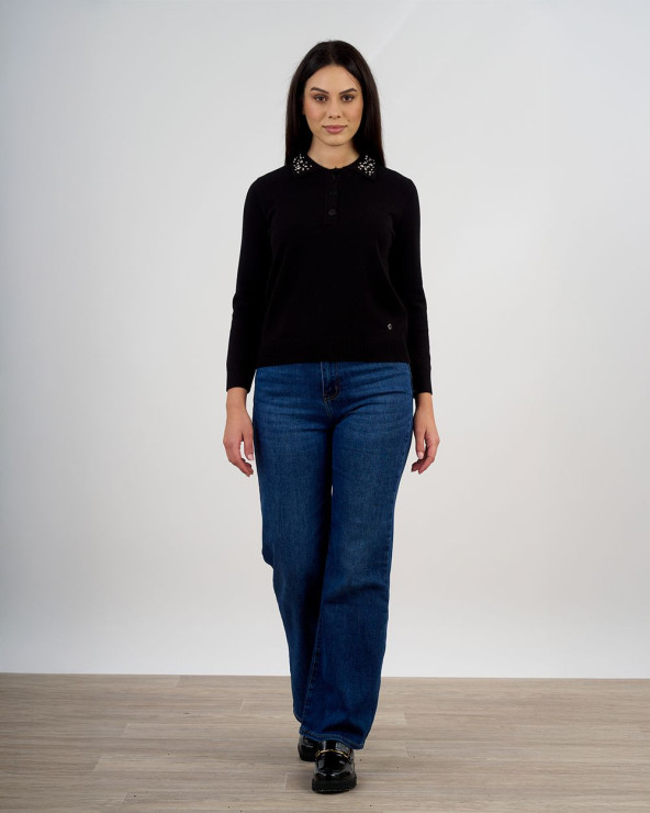 Realizzata in morbido filato elasticizzato, presenta un elegante colletto decorato con applicazioni gioiello e una mezza abbottonatura frontale con bottoni tono su tono.