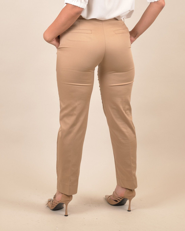 Il taglio classico e affusolato valorizza la silhouette, mentre il tessuto elasticizzato garantisce libertà di movimento e comfort duraturo. Il modello presenta tasche laterali, passanti in vita e chiusura frontale con bottone e zip, per un look curato in ogni dettaglio.