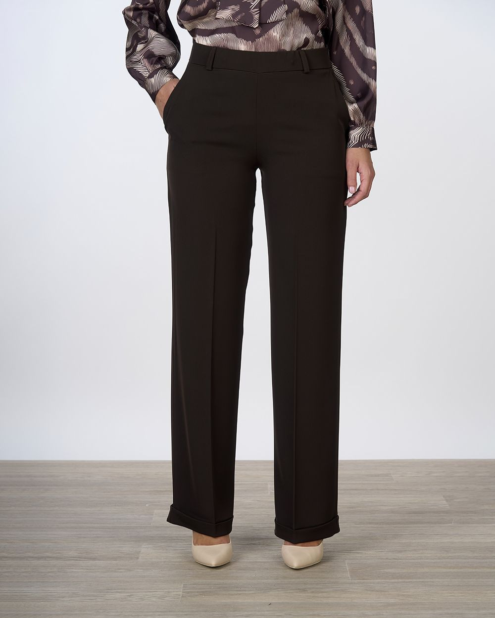 Questi pantaloni palazzo in cady marrone sono un capo elegante e senza tempo, pensato per valorizzare la silhouette con una linea ampia e scivolata. La piega stirata sul davanti dona verticalità e raffinatezza, mentre il risvolto al fondo aggiunge un dettaglio moderno e distintivo che li rende unici. La vita regolare assicura una vestibilità confortevole, mentre il tessuto fluido accompagna con naturalezza i movimenti, garantendo uno stile impeccabile in ogni occasione.
