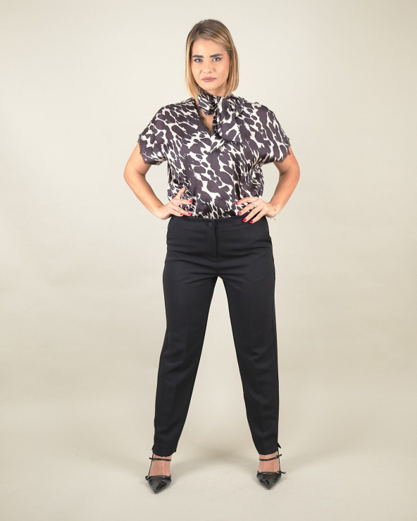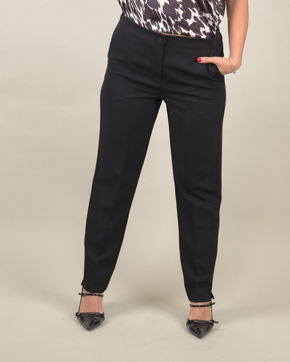La linea dritta e pulita slancia la figura, mentre la piega centrale aggiunge un dettaglio sartoriale. Il punto vita medio con chiusura a bottone e zip dona struttura, mentre l’elastico sul retro assicura praticità e comfort durante tutta la giornata. Perfetti per completare un tailleur con blazer o da indossare con bluse morbide e camicie per un’eleganza quotidiana.