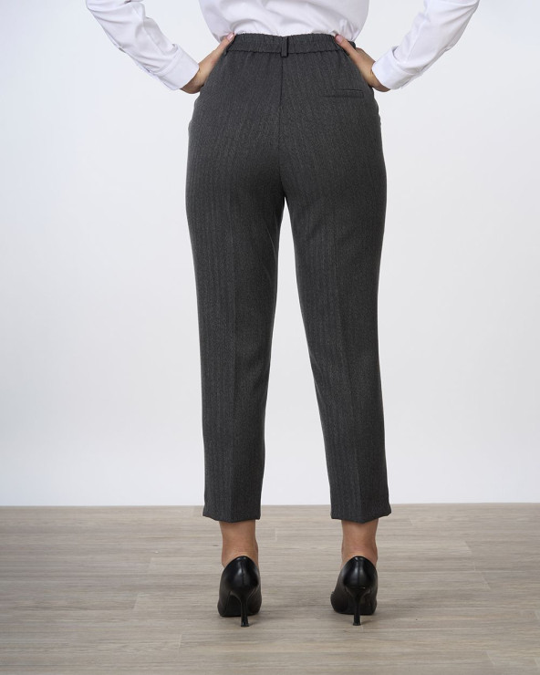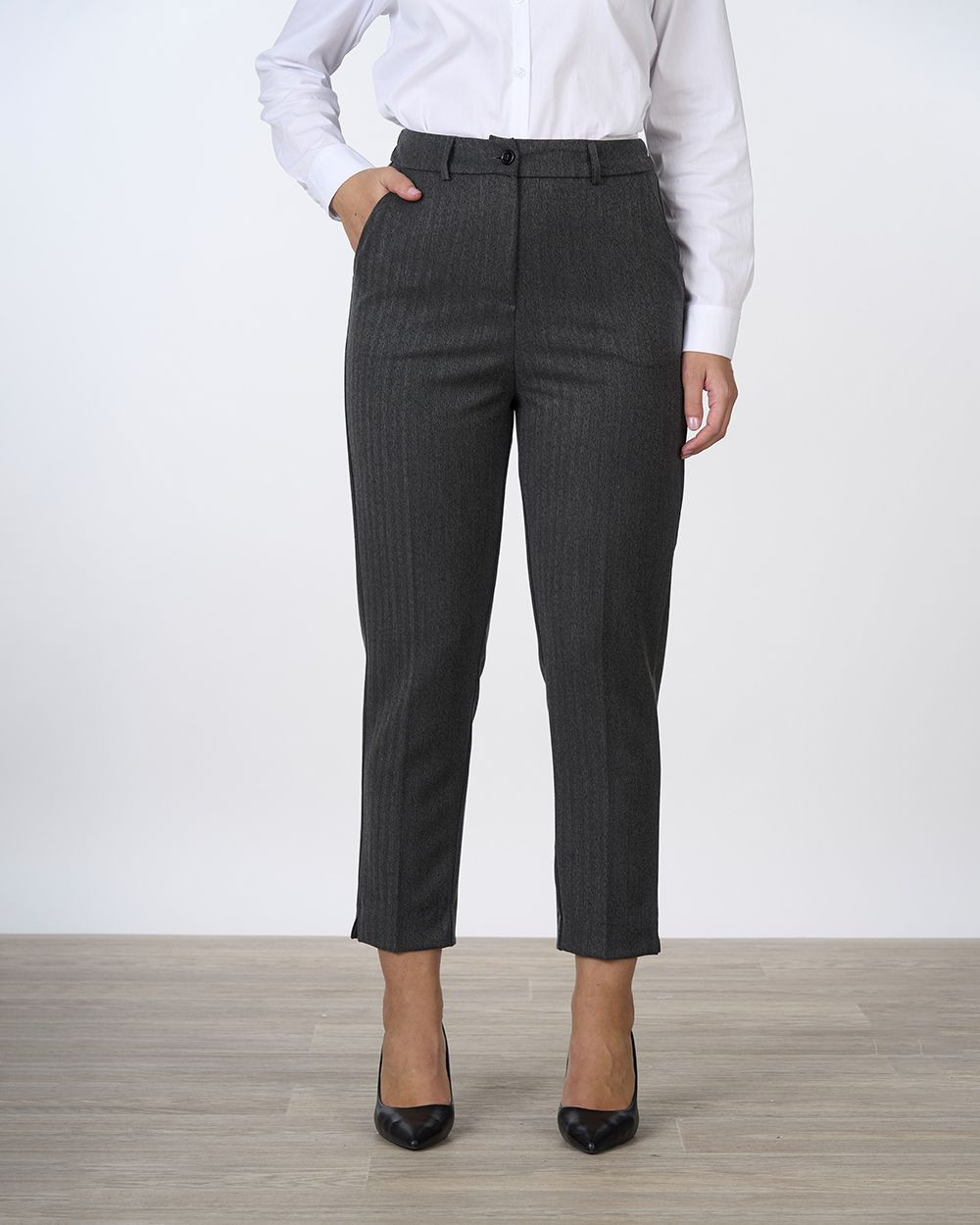 Questi pantaloni a sigaretta spigati sono un capo intramontabile, pensato per la donna che ama un’eleganza sobria ma di carattere. Realizzati in tessuto morbido e leggermente elasticizzato, presentano il classico motivo a lisca di pesce che dona profondità e un tocco sartoriale al design. La linea dritta e affusolata alla caviglia slancia la silhouette e li rende perfetti sia per look formali che per outfit più casual.