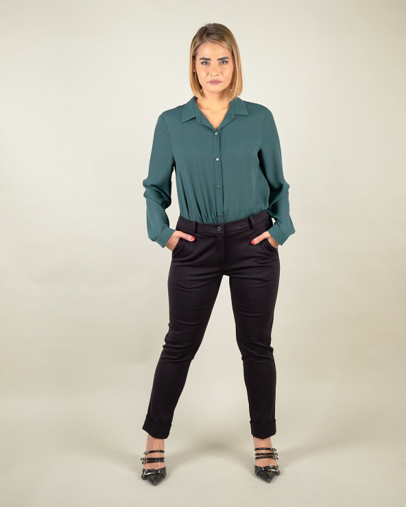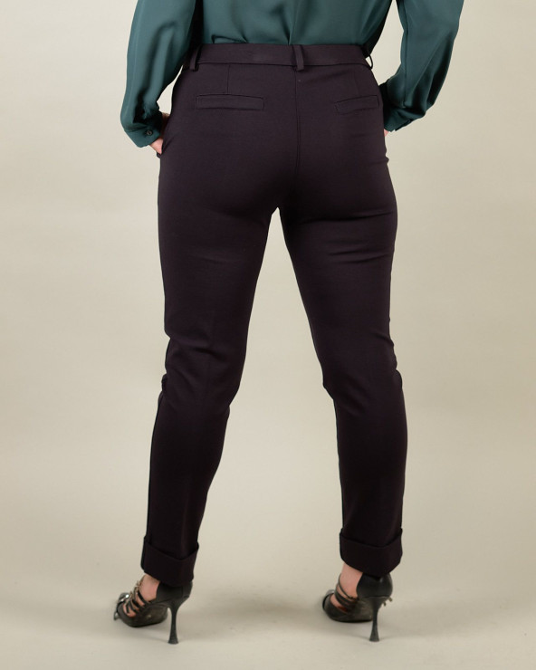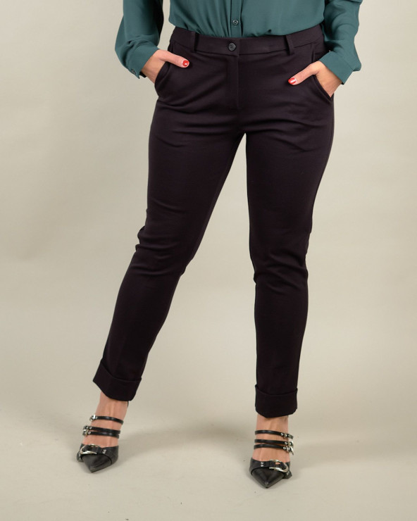 Il modello presenta linea slim, pieghe frontali stirate che slanciano la figura, vita regolare con passanti, tasche laterali e fondo con risvolto, dettaglio che aggiunge un tocco sartoriale e contemporaneo.