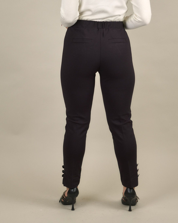 La linea pulita è impreziosita dai bottoni decorativi sul fondo gamba, che aggiungono un tocco raffinato e ricercato. La vita elasticizzata garantisce praticità e libertà di movimento, rendendo questo modello perfetto per ogni momento della giornata.