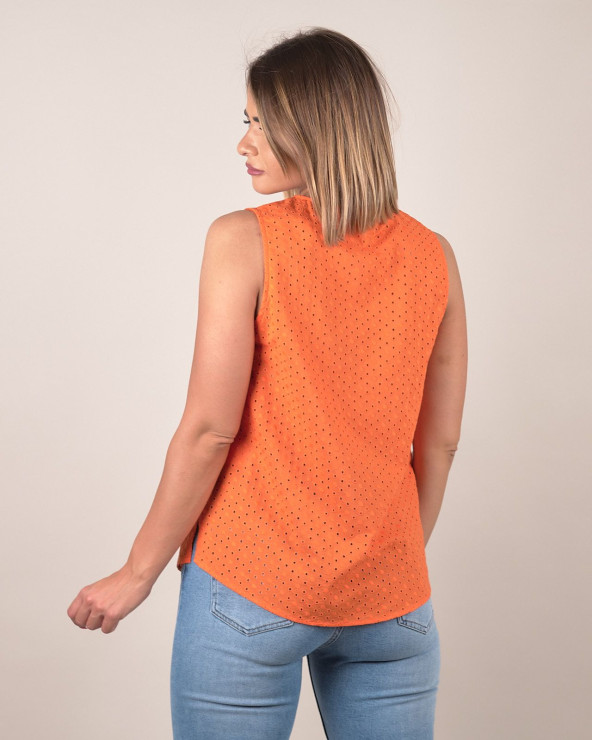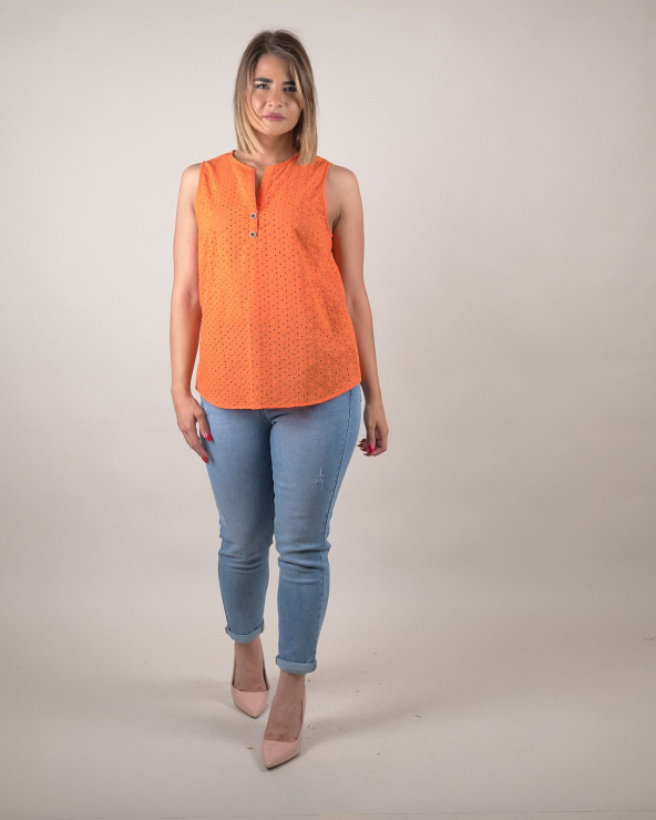 Fresco e femminile, questo top smanicato in 100% cotone è un must-have per l’estate. Il tessuto sangallo dona un effetto traforato delicato e romantico, perfetto per valorizzare ogni outfit con un tocco raffinato. Il modello presenta uno scollo a V con abbottonatura decorativa frontale e taglio leggermente svasato che cade morbido sui fianchi, assicurando comfort e vestibilità ottimale anche alle silhouette curvy.