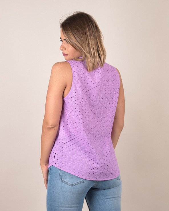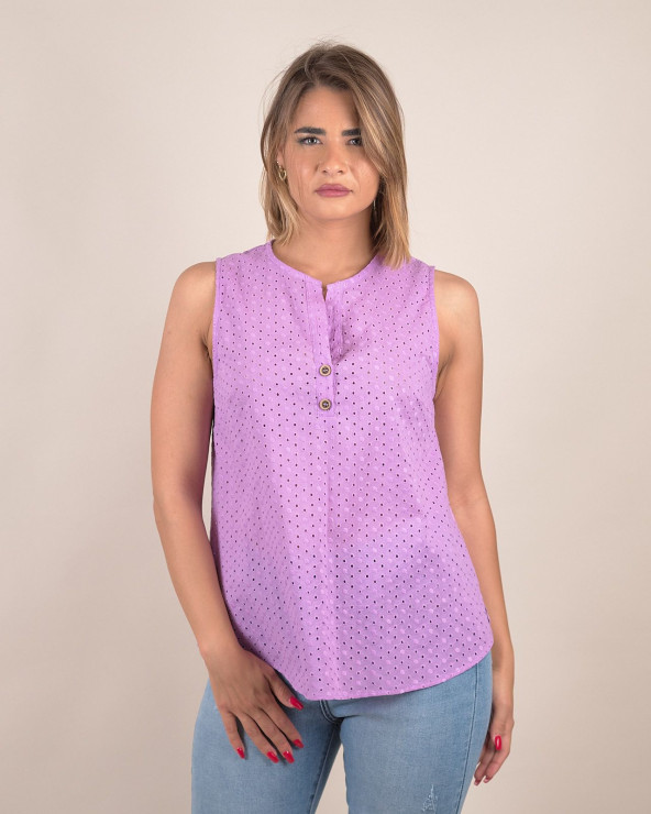 Fresco e femminile, questo top smanicato in 100% cotone è un must-have per l’estate. Il tessuto sangallo dona un effetto traforato delicato e romantico, perfetto per valorizzare ogni outfit con un tocco raffinato. Il modello presenta uno scollo a V con abbottonatura decorativa frontale e taglio leggermente svasato che cade morbido sui fianchi, assicurando comfort e vestibilità ottimale anche alle silhouette curvy.